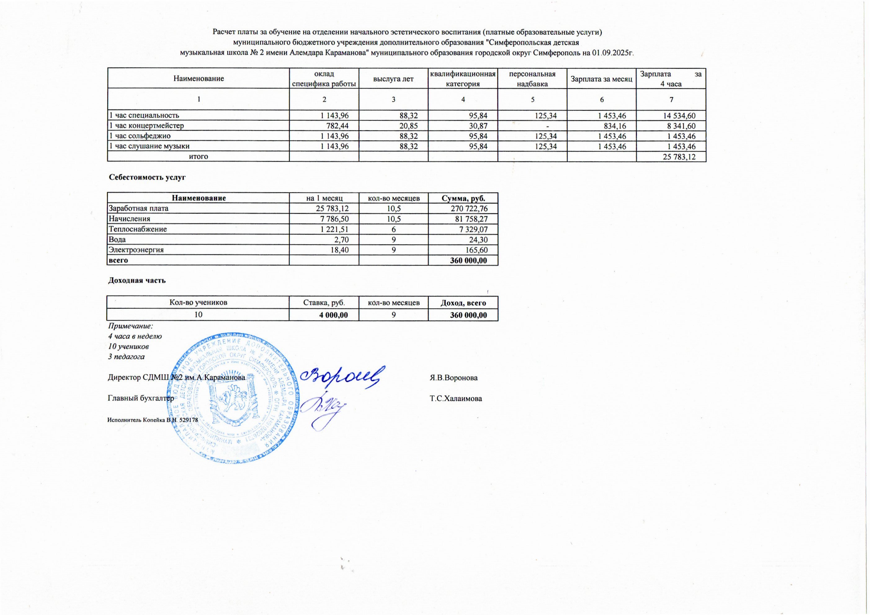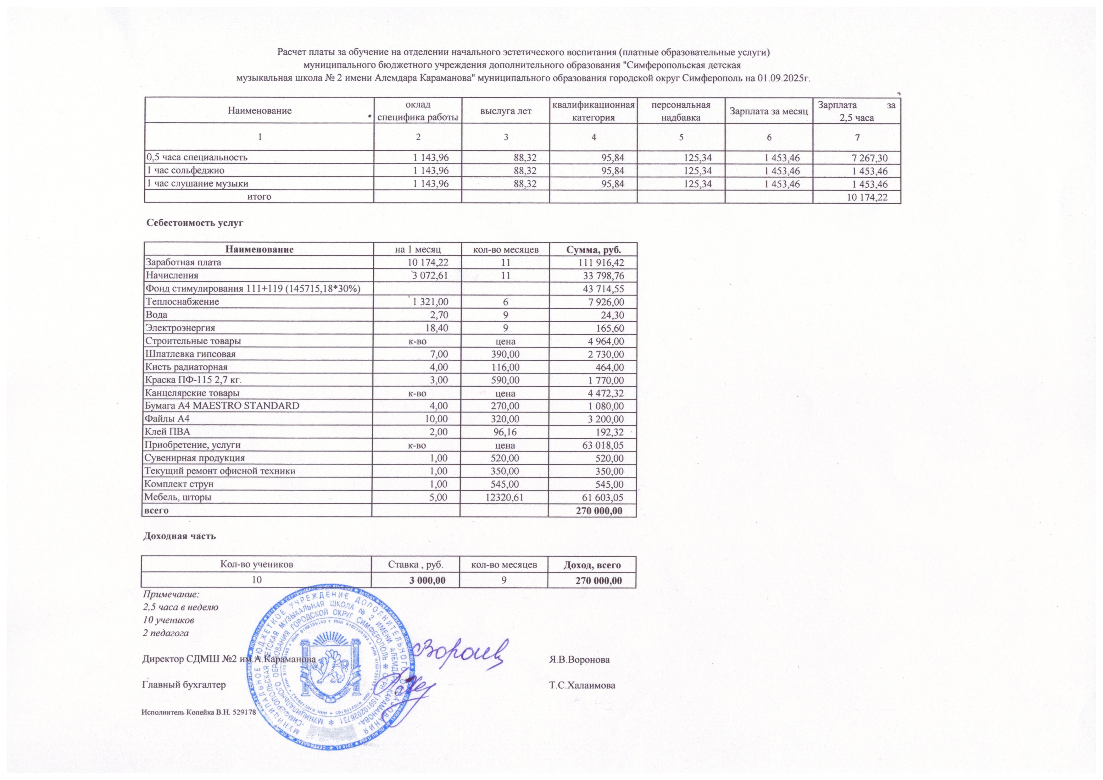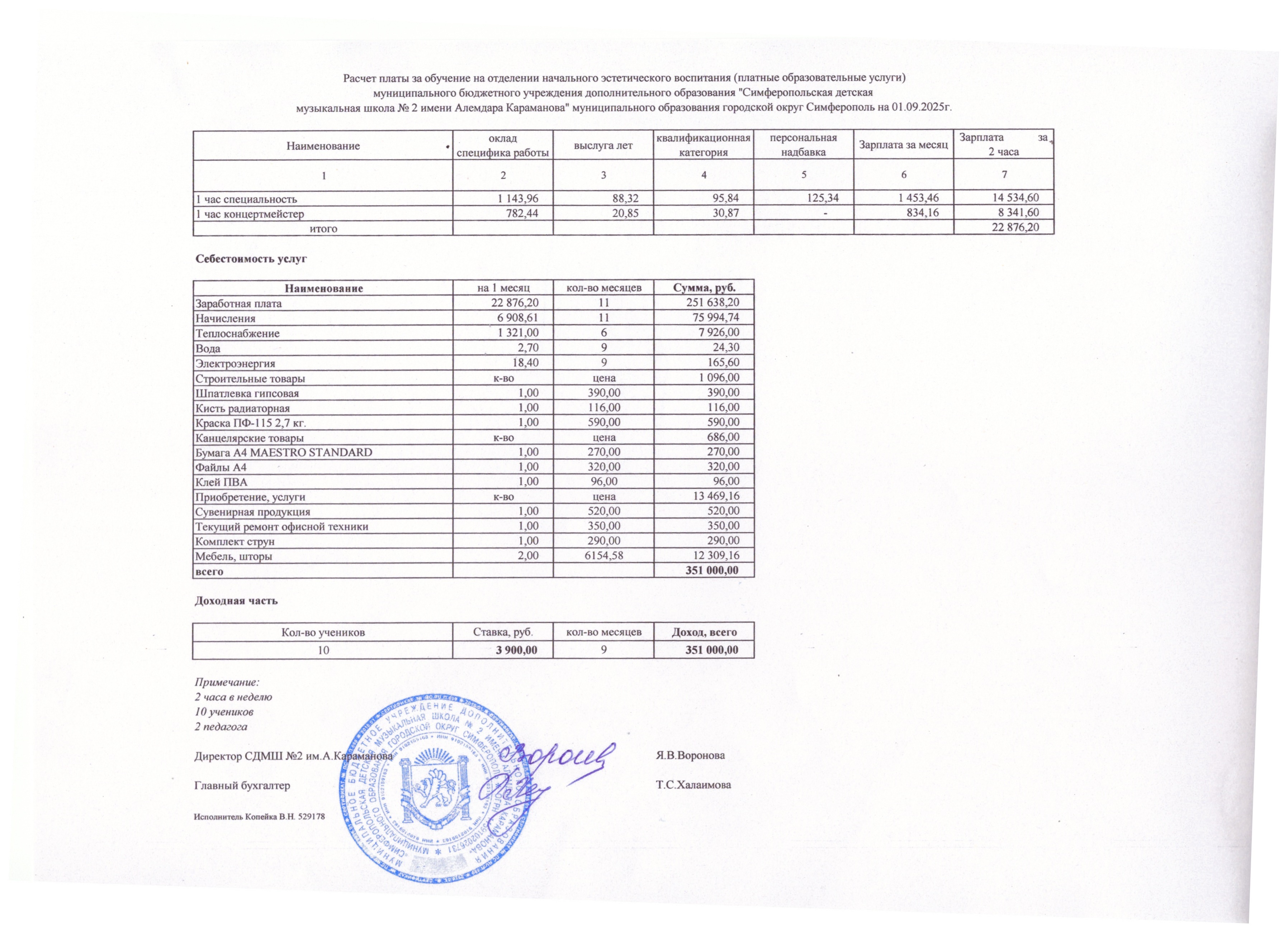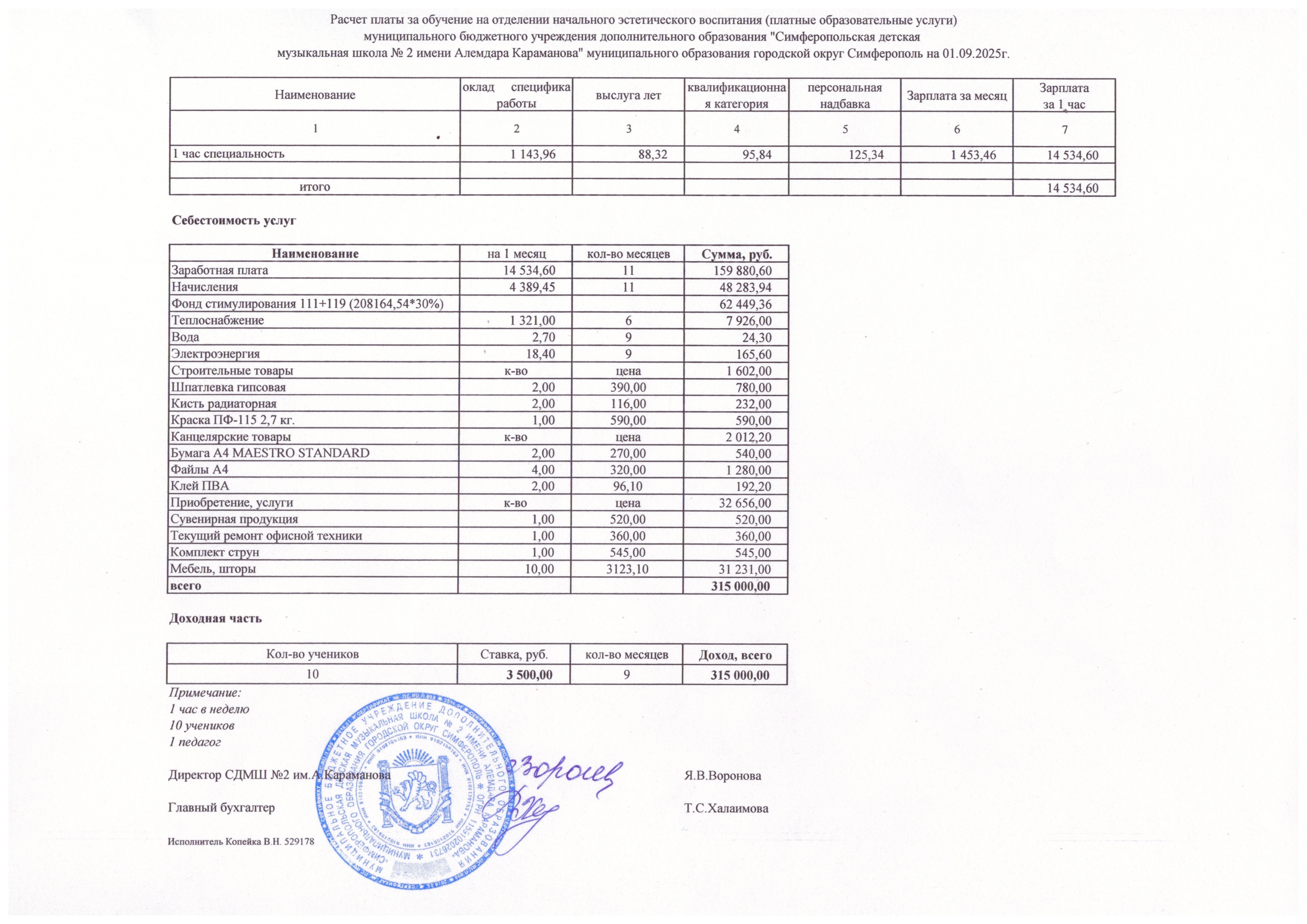 Установлена ежемесячная оплата за обучение обучающихся отделения начального эстетического воспитания (платные образовательные услуги), зачисленных с 01 сентября 2025 года по 31 мая 2026 года в соответствии со сметой в следующих размерах: