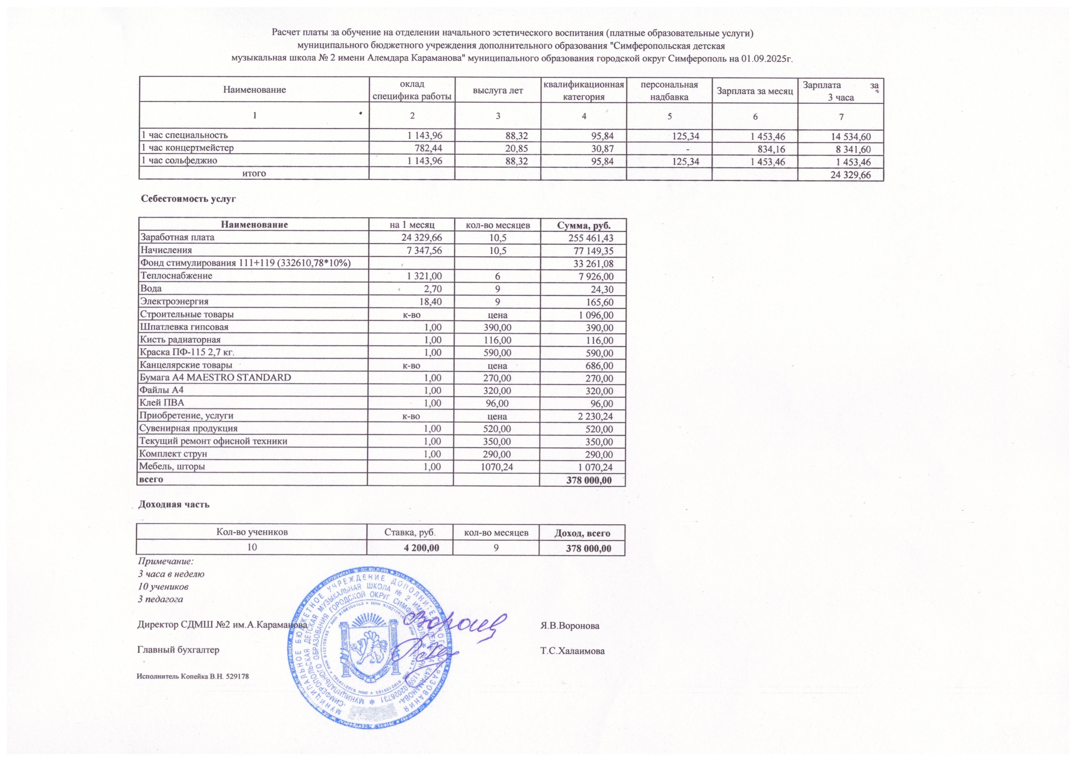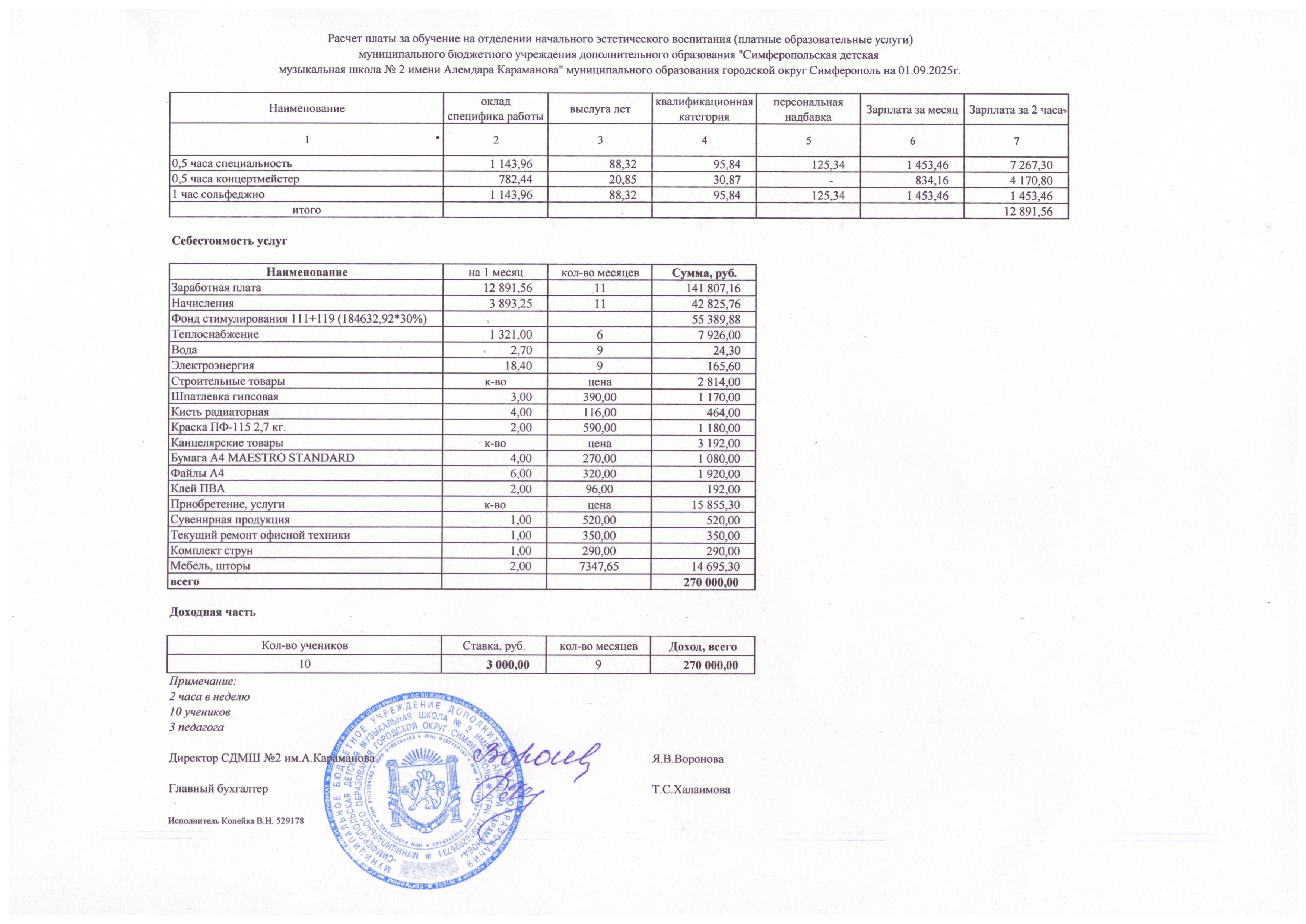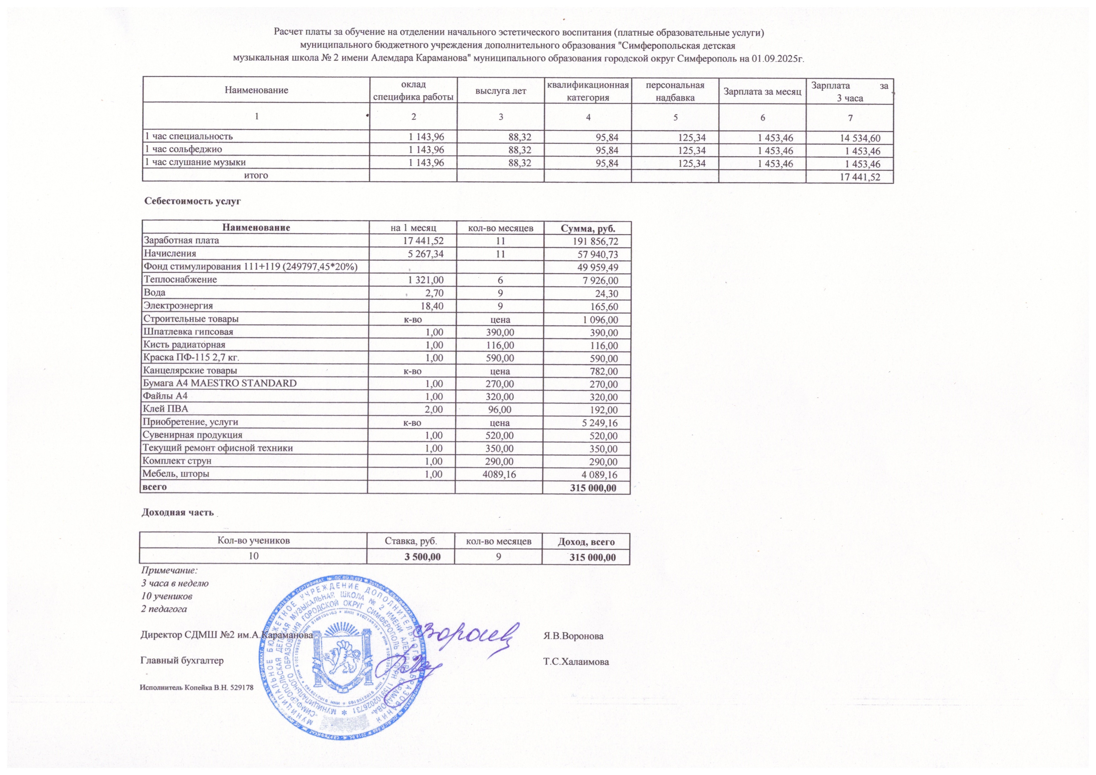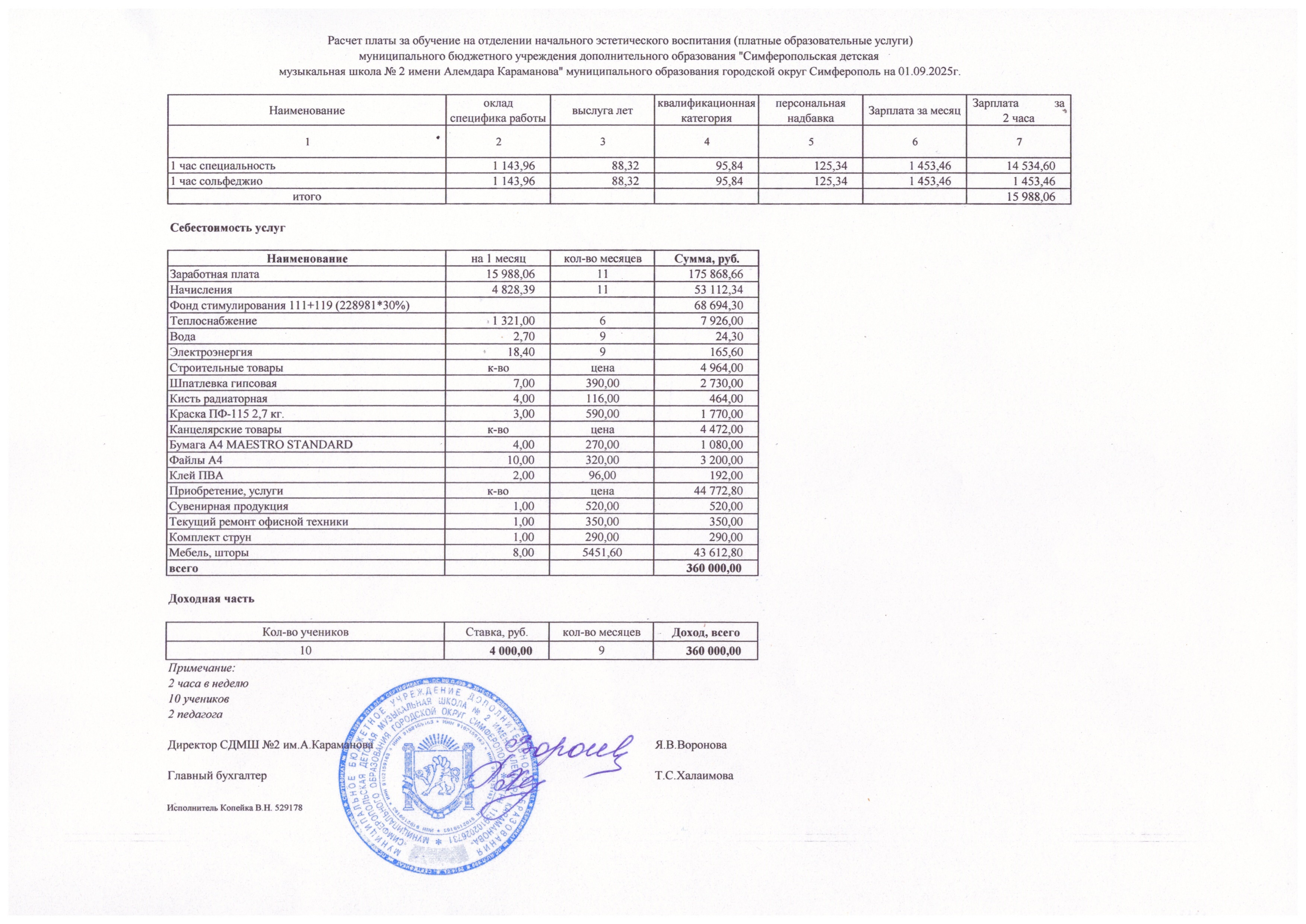 Установлена ежемесячная оплата за обучение обучающихся отделения начального эстетического воспитания (платные образовательные услуги), зачисленных с 01 сентября 2025 года по 31 мая 2026 года в соответствии со сметой в следующих размерах: